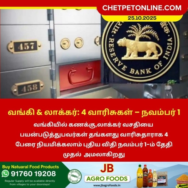 வங்கியில் கணக்கு, லாக்கர் வசதியை பயன்படுத்துபவர்கள் தங்களது வாரிசுதாராக 4 பேரை நியமிக்கலாம் புதிய விதி நவம்பர் 1-ம் தேதி முதல் அமலாகிறது.