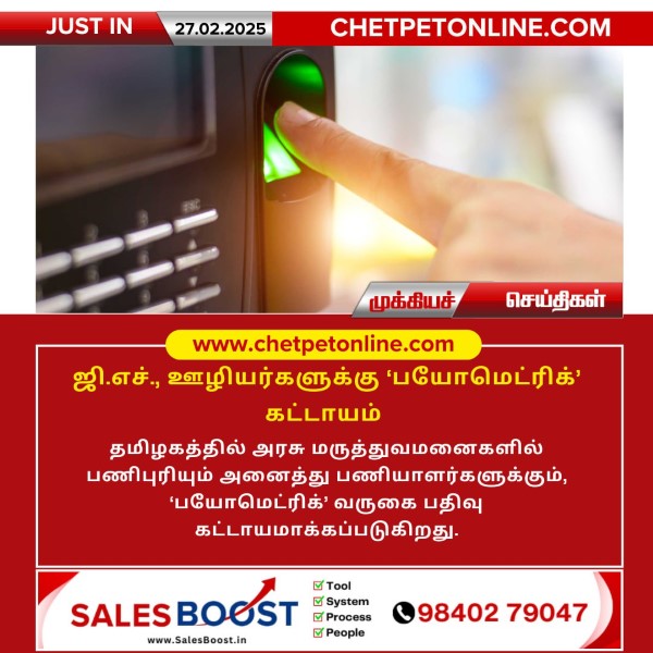 தமிழகத்தில் அரசு மருத்துவமனைகளில் பணிபுரியும் அனைத்து பணியாளர்களுக்கும், ‘பயோமெட்ரிக்’ வருகை பதிவு கட்டாயமாக்கப்படுகிறது.