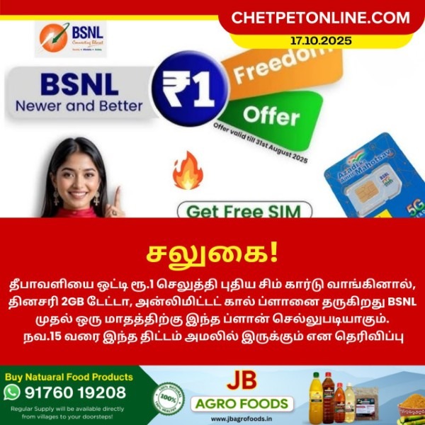தீபாவளியை ஒட்டி ரூ.1 செலுத்தி புதிய சிம் கார்டு வாங்கினால், தினசரி 2GB டேட்டா, அன்லிமிட்டட் கால் ப்ளானை தருகிறது BSNL முதல் ஒரு மாதத்திற்கு இந்த ப்ளான் செல்லுபடியாகும். நவ.15 வரை இந்த திட்டம் அமலில் இருக்கும் என தெரிவிப்பு.