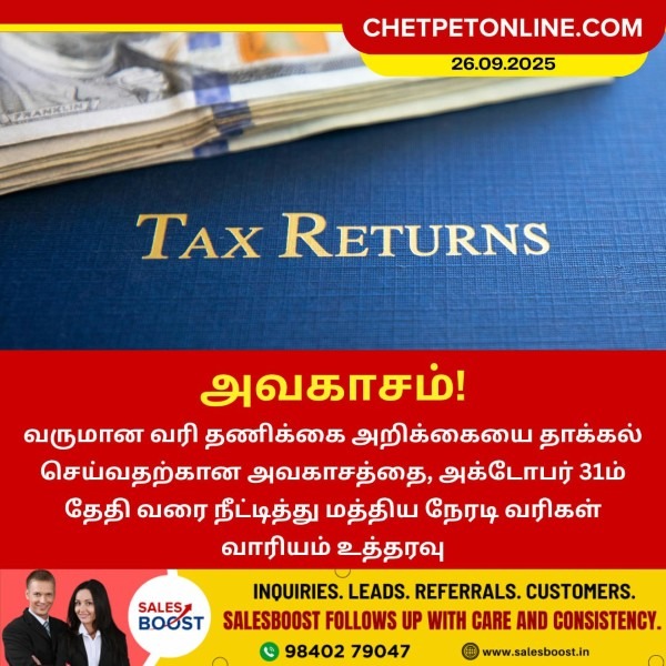 வருமான வரி தணிக்கை அறிக்கையை தாக்கல் செய்வதற்கான அவகாசத்தை, அக்டோபர் 31ம் தேதி வரை நீட்டித்து மத்திய நேரடி வரிகள் வாரியம் உத்தரவுவிட்டுள்ளது.