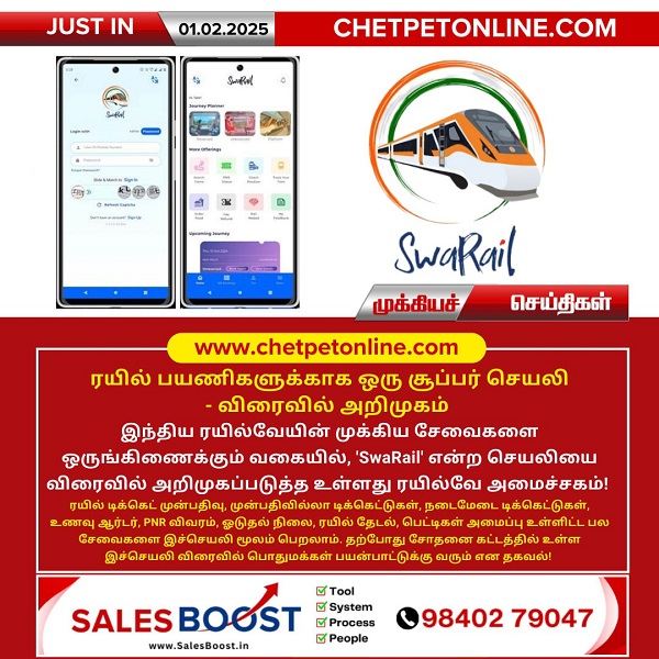 இந்திய ரயில்வேயின் முக்கிய சேவைகளை ஒருங்கிணைக்கும் வகையில், ‘SwaRail’ என்ற செயலியை விரைவில் அறிமுகப்படுத்த உள்ளது ரயில்வே அமைச்சகம்! ரயில் டிக்கெட் முன்பதிவு, முன்பதிவில்லா டிக்கெட்டுகள், நடைமேடை டிக்கெட்டுகள், உணவு ஆர்டர், PNR விவரம், ஓடுதல் நிலை, ரயில் தேடல், பெட்டிகள் அமைப்பு உள்ளிட்ட பல சேவைகளை இச்செயலி மூலம் பெறலாம். தற்போது சோதனை கட்டத்தில் உள்ள இச்செயலி விரைவில் பொதுமக்கள் பயன்பாட்டுக்கு வரும் என தகவல்!