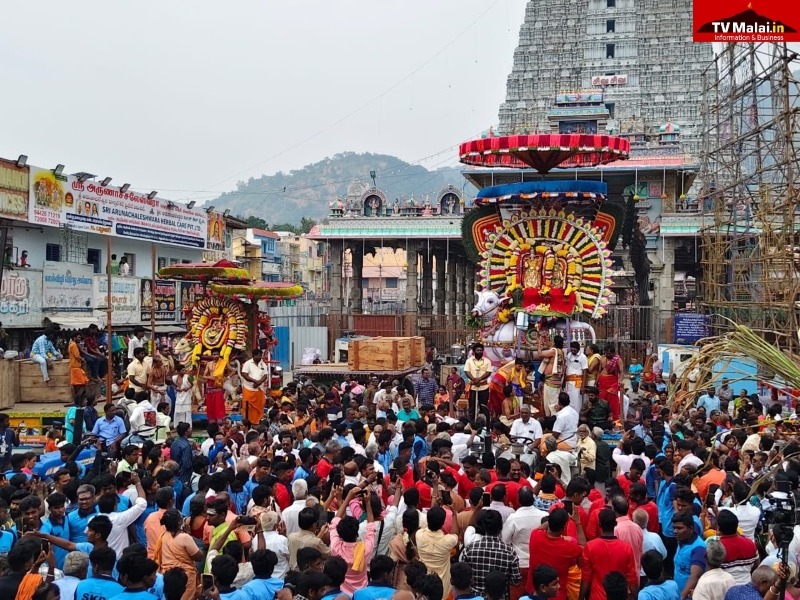 திருவண்ணாமலை அண்ணாமலையார் திருக்கோயிலில் திருக்கார்த்திகை தீபத் திருவிழா ஐந்தாம் நாளான இன்று (28.11.2025) காலை விநாயகர் ரிஷப வாகனத்திலும், சந்திரசேகரர் கண்ணாடி ரிஷப வாகனத்திலும், வலம் வந்து பக்தர்களுக்கு அருள்பாலித்தனர். இதில் திரளான பக்தர்கள் கலந்து கொண்டு சாமி தரிசனம் செய்தனர்.