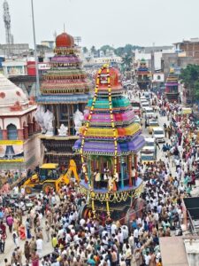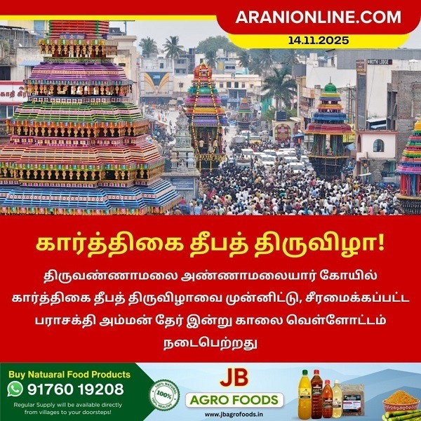 திருவண்ணாமலை அண்ணாமலையார் கோயில் கார்த்திகை தீபத் திருவிழாவை முன்னிட்டு, சீரமைக்கப்பட்ட பராசக்தி அம்மன் தேர் இன்று காலை வெள்ளோட்டம்.ரூ.72 லட்சம் மதிப்பீட்டில் 48 அடி உயரத்தில் புனரமைக்கப்பட்ட இத்தேரை, பக்தர்கள் வடம் பிடித்து இழுத்தனர்.