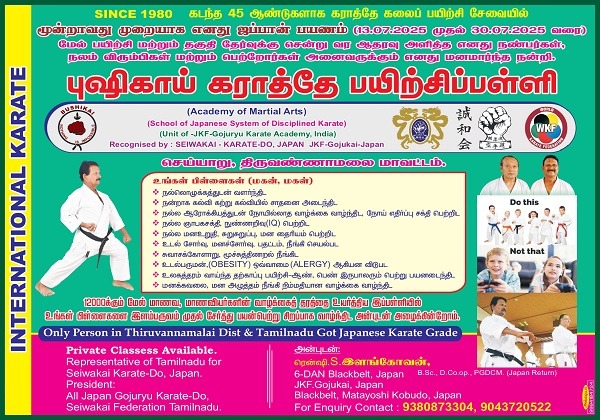 45 ஆண்டுகளாக கராத்தே தற்காப்பு கலைக்காக அர்ப்பணித்து செயல்பட்டு வரும் புஷிகாய் கராத்தே பயிற்சிபள்ளியின் நிறுவனர் திரு S. இளங்கோவன்‌, கடந்த மாதம் (13.07.2025 முதல் 30.07.2025 வரை) மூன்றாவது முறையாக ஜப்பான் பயணம் செய்து மேம்பட்ட பயிற்சி மற்றும் தகுதி தேர்வில் கலந்து கொண்டார்.