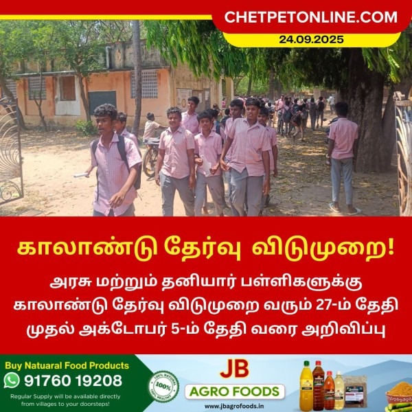 அரசு மற்றும் தனியார் பள்ளிகளுக்கு காலாண்டு தேர்வு விடுமுறை வரும் 27-ம் தேதி முதல் அக்டோபர் 5-ம் தேதி வரை அறிவித்துள்ளது.