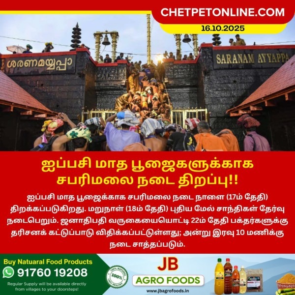 ஐப்பசி மாத பூஜைக்காக சபரிமலை நடை நாளை (17ம் தேதி) திறக்கப்படுகிறது. மறுநாள் (18ம் தேதி) புதிய மேல் சாந்திகள் தேர்வு நடைபெறும். ஜனாதிபதி வருகையையொட்டி 22ம் தேதி பக்தர்களுக்கு தரிசனக் கட்டுப்பாடு விதிக்கப்பட்டுள்ளது. அன்று இரவு 10 மணிக்கு நடை சாத்தப்படும்.