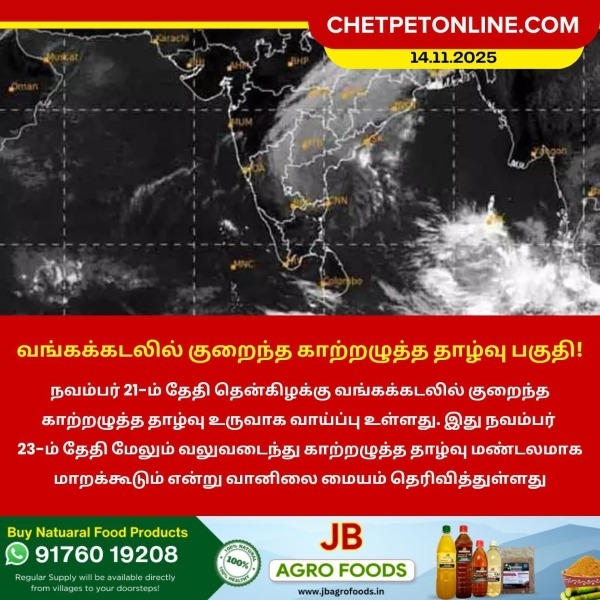 நவம்பர் 21-ம் தேதி தென்கிழக்கு வங்கக்கடலில் குறைந்த காற்றழுத்த தாழ்வு உருவாக வாய்ப்பு உள்ளது. இது நவம்பர் 23-ம் தேதி மேலும் வலுவடைந்து காற்றழுத்த தாழ்வு மண்டலமாக மாறக்கூடும் என்று வானிலை மையம் தெரிவித்துள்ளது.