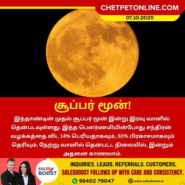 இந்தாண்டின் முதல் சூப்பர் மூன் இன்று இரவு வானில் தென்படவுள்ளது. இந்த பௌர்ணமியின்போது சந்திரன் வழக்கத்தை விட 14% பெரியதாகவும், 30% பிரகாசமாகவும் தெரியும். நேற்று வானில் தென்பட்ட நிலையில், இன்றும் அதனை காணலாம்.