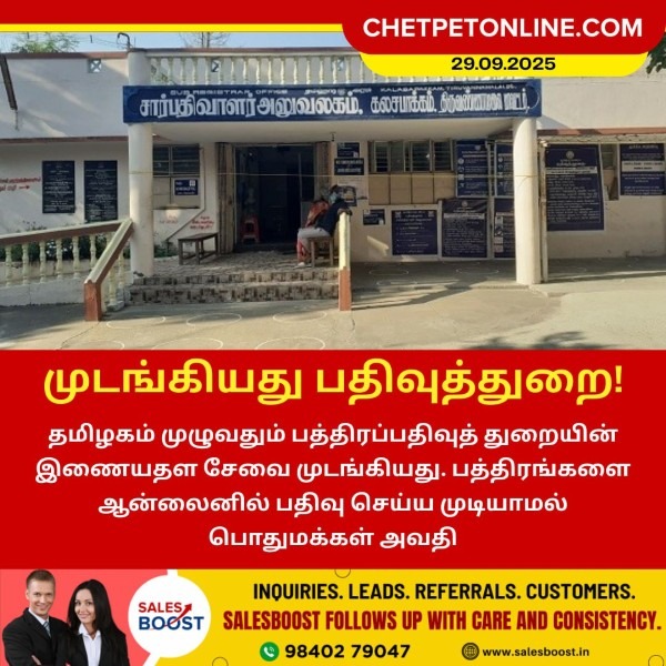 தமிழகம் முழுவதும் பத்திரப்பதிவுத் துறையின் இணையதள சேவை முடங்கியது. பத்திரங்களை ஆன்லைனில் பதிவு செய்ய முடியாமல் பொதுமக்கள் அவதி.