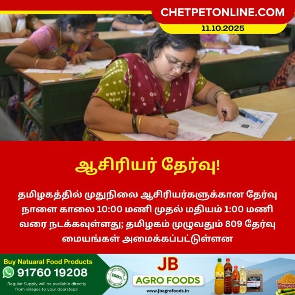 தமிழகத்தில் முதுநிலை ஆசிரியர்களுக்கான தேர்வு நாளை காலை 10:00 மணி முதல் மதியம் 1:00 மணி வரை நடக்கவுள்ளது. தமிழகம் முழுவதும் 809 தேர்வு மையங்கள் அமைக்கப்பட்டுள்ளன.