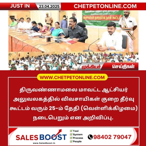 திருவண்ணாமலை மாவட்ட ஆட்சியர் அலுவலகத்தில் விவசாயிகள் குறை தீர்வு கூட்டம் வரும் 25-ம் தேதி (வெள்ளிக்கிழமை) நடைபெறும் என அறிவிப்பு.