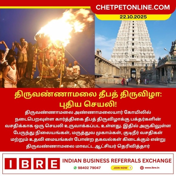 திருவண்ணாமலை அண்ணாமலையார் கோயிலில் நடைபெறவுள்ள கார்த்திகை தீபத் திருவிழாக்கு பக்தர்களின் வசதிக்காக ஒரு செயலி உருவாக்கப்பட உள்ளது. இதில் அருகிலுள்ள பேருந்து நிலையங்கள், மருத்துவ முகாம்கள், குடிநீர் வசதிகள் மற்றும் உதவி மையங்கள் போன்ற தகவல்கள் கிடைக்கும் என்று திருவண்ணாமலை மாவட்ட ஆட்சியர் தெரிவித்தார்.