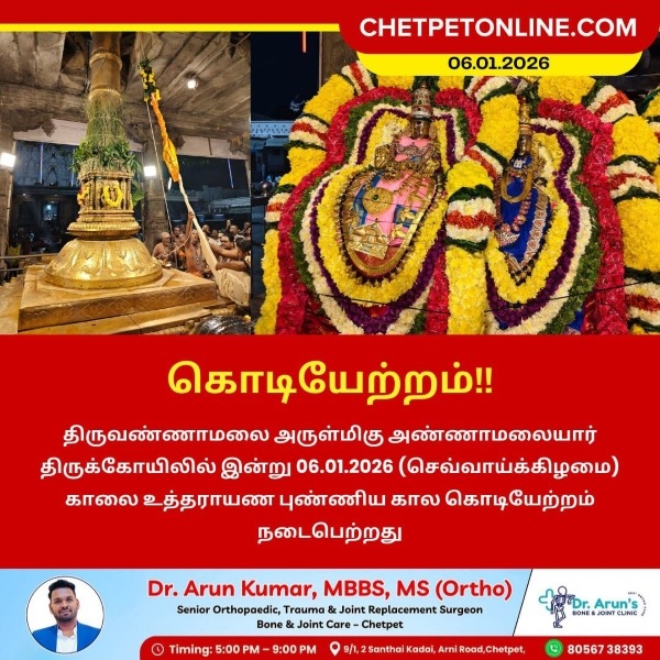திருவண்ணாமலை அருள்மிகு அண்ணாமலையார் திருக்கோயிலில், இன்று 06.01.2026 (செவ்வாய்க்கிழமை) காலை, உத்தராயண புண்ணிய காலத்தை முன்னிட்டு கொடியேற்றம் சிறப்பாக நடைபெற்றது.