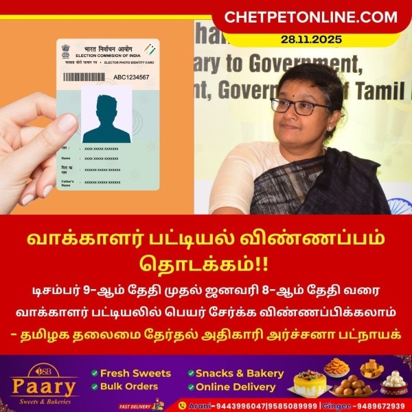 டிசம்பர் 9-ஆம் தேதி முதல் ஜனவரி 8-ஆம் தேதி வரை வாக்காளர் பட்டியலில் பெயர் சேர்க்க விண்ணப்பிக்கலாம் என தமிழக தலைமை தேர்தல் அதிகாரி அர்ச்சனா பட்நாயக் அறிவித்துள்ளார்.