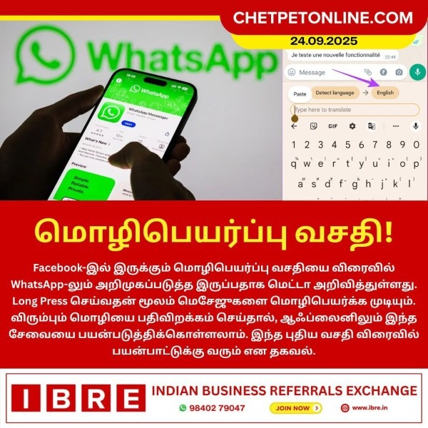 Facebook-இல் இருக்கும் மொழிபெயர்ப்பு வசதியை விரைவில் WhatsApp-லும் அறிமுகப்படுத்த இருப்பதாக மெட்டா அறிவித்துள்ளது. Long Press செய்வதன் மூலம் மெசேஜுகளை மொழிபெயர்க்க முடியும். விரும்பும் மொழியை பதிவிறக்கம் செய்தால், ஆஃப்லைனிலும் இந்த சேவையை பயன்படுத்திக்கொள்ளலாம். இந்த புதிய வசதி விரைவில் பயன்பாட்டுக்கு வரும் என தகவல்.